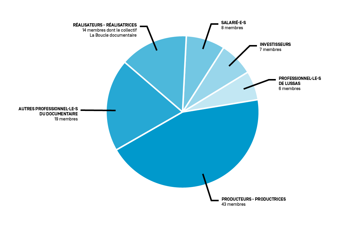 La SCIC Tënk regroupe 97 sociétaires. Ces personnes ou structures sont réunies en différents collèges, caractérisant la démarche coopérative du projet. Ainsi sont représentés les auteur·e·s, les producteurs·trices, ainsi que les autres professionnel·le·s du cinéma et de la culture (organismes de formations, centres de ressources, monteurs, ingénieurs du son, étalonneurs, etc). À ces collèges, se rajoutent d’autres qui incarnent et soutiennent le projet territorial de Tënk, né et basé à Lussas en Ardèche : un collège Salarié·e·s de Tënk, un collège Professionnel·le·s du documentaire basé·e·s à Lussas, et enfin un collège Investisseurs où l’on retrouve aussi bien des financeurs privés et des collectivités locales : la Communauté de communes Berg-et-Coiron et la Commune de Lussas, bientôt rejointe par d’autres communes voisines.