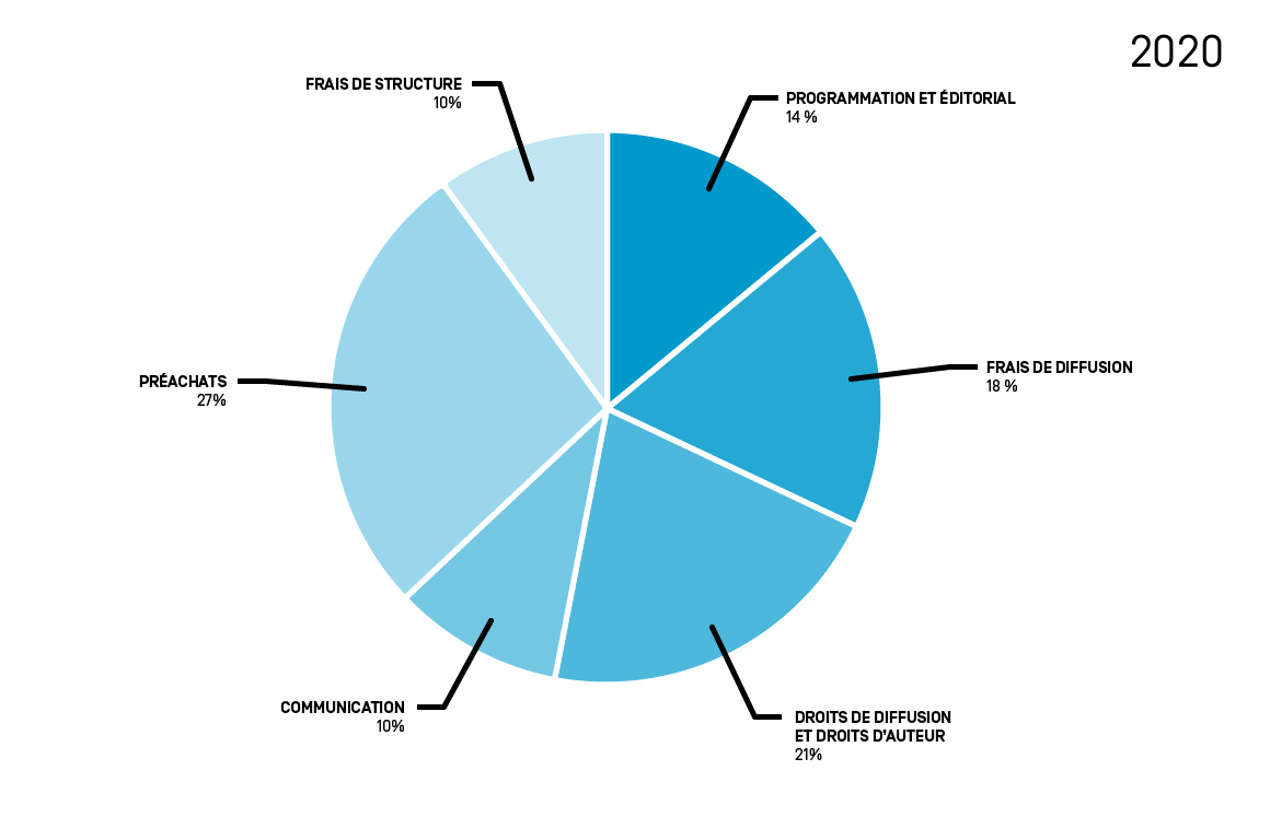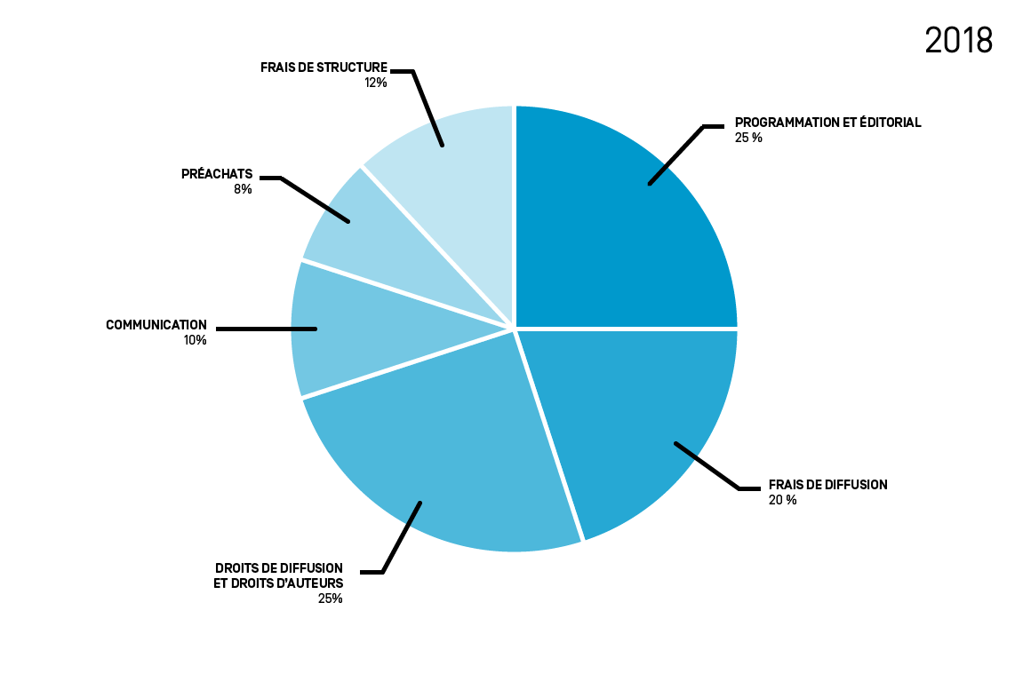 L’objectif est ainsi de contribuer de façon significative à l’économie du documentaire. Cela se traduit par un budget qui valorise la rémunération des ayants-droit (droits de diffusion, droits d’auteurs, préachats). Cette année, cela représente 32 % du budget :