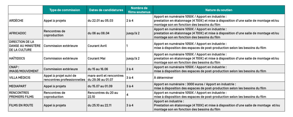 - Nous sommes reconnus comme diffuseur par le CNC et nos préachats permettent de prétendre aux aides à la production nécessitant l’accompagnement d’un diffuseur (CNC, Régions, Procirep). Nos préachats sont constitués a minima d’un apport en numéraire de 1 050 euros (à l’exception du dispositif Film en route) et d’un apport en industrie (mise à disposition d’espaces de post-production). En fonction du type de partenariat développé, nous pouvons parfois amener un apport en numéraire plus important et/ou une prestation en étalonnage (comprenant le salaire du technicien). Pour plus de précisions sur les droits demandés et les montants, n’hésitez pas à nous contacter.